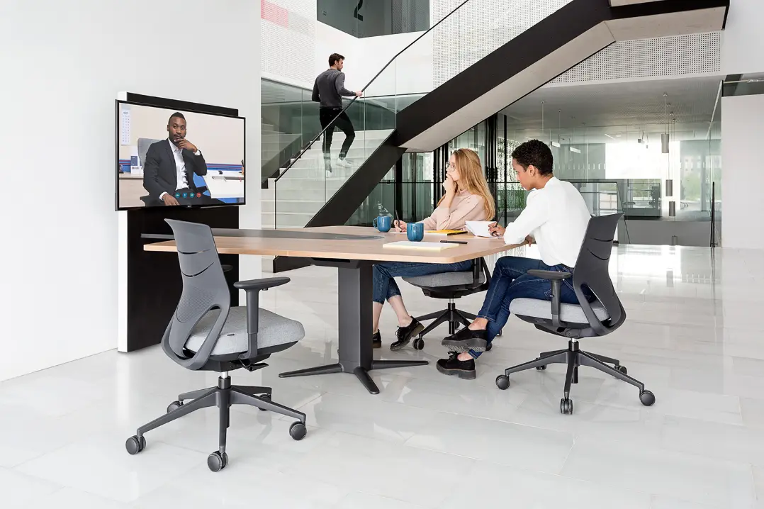 Mesas de reunión con apoyo central, fijas o elevables, perfectas para videoconferencias o espacios colaborativos de alto nivel funcional
