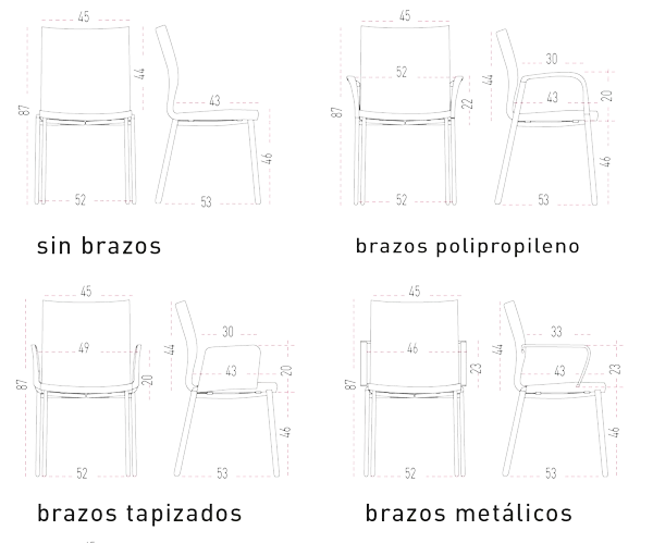 La silla Uma de 4 patas puede configurarse con diferentes tipos de brazos que amplían sus posibilidades de uso y personalización. Se puede elegir entre brazos cerrados de polipropileno en color negro, con recubrimiento reforzado con un 10% de fibra de vidrio que aporta mayor resistencia; brazos tapizados, con estructura interior de acero (pletina de 20 x 6 mm y varilla calibrada de 8 mm de diámetro) recubierta de espuma inyectada para un tacto más cálido y confortable; brazos metálicos fijos, fabricados con alma de acero calibrado de 25 x 7 mm y recubrimiento de polipropileno, que ofrecen una estética robusta y elegante; y una opción con pala de escritura en compacto fenólico blanco de 13 mm de espesor, que puede colocarse a la izquierda o a la derecha, ideal para auditorios, aulas de formación o salas polivalentes.