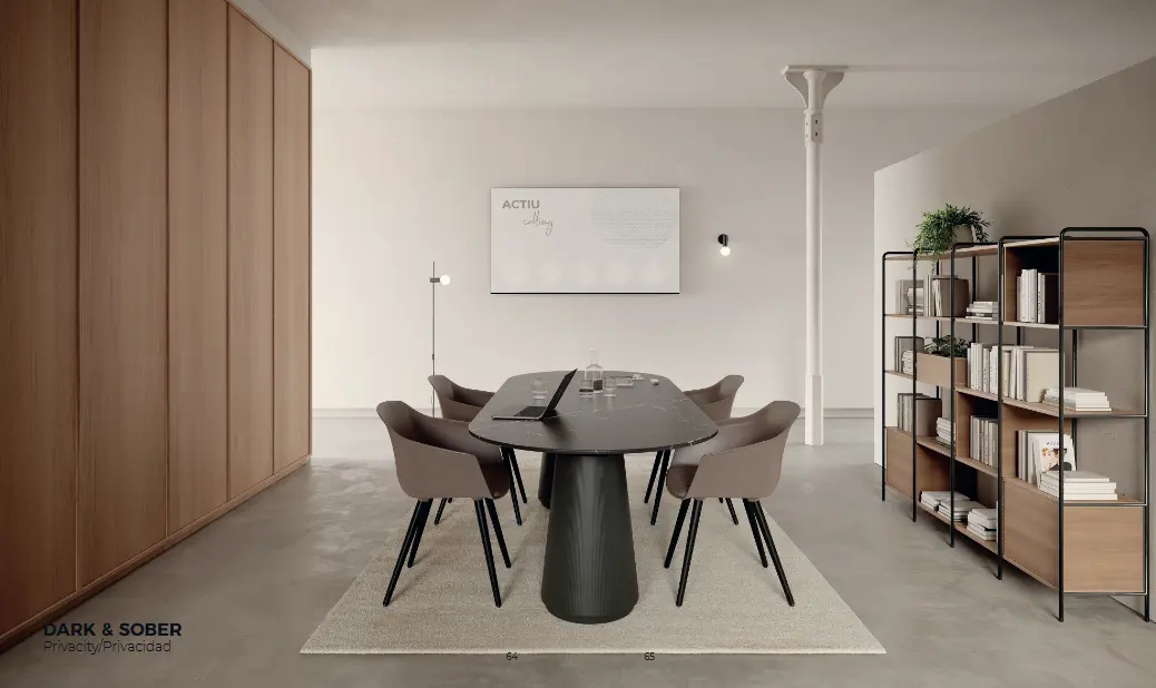 Una paleta sobria con negros, grises profundos y maderas oscuras. Ideal para espacios premium, zonas de privacidad o áreas ejecutivas.