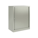 Este modelo de armario bajo tiene una altura regulable de 1070 a 1085 milímetros y un ancho de 800 milímetros. El fondo de 47 centímetros es fijo en todos los muebles de archivo de la serie Essentials de Bisley. El armario cuenta con una puerta plegable tipo persiana, cuyas lamas se deslizan hacia la parte izquierda para cerrarse y queda enrollada en la derecha cuando se abre. Este sistema de cierre permite ahorrar espacio en zonas de archivo de tamaño reducido. Además incluye cierre con llave para mayor seguridad.