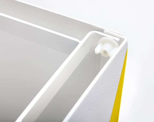 La papelera metálica de reciclaje Vevey se envía desmontada. Su ensamblaje es muy sencillo, con 8 tronillos de mariposa. En su interior cuenta con un aro para sujetar la bolsa fabricado en chapa de hierro de 3 milímetros. Cuenta con una base con tacos de goma para proteger el pavimento en el que se instale.