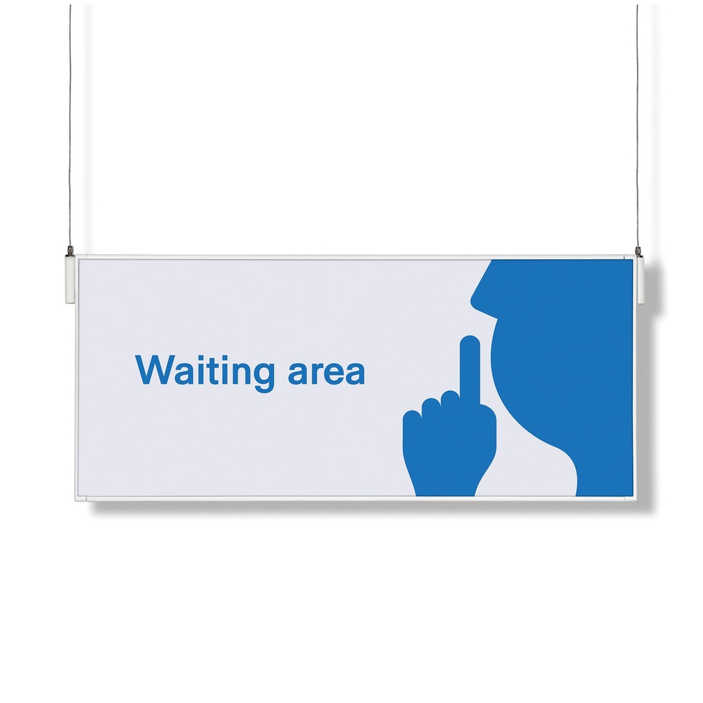 Doble marco de 64 x 21 cm en aluminio blanco con plástico protector que se extrae con ventosa para personalización; se cuelga del techo mediante cable de acero