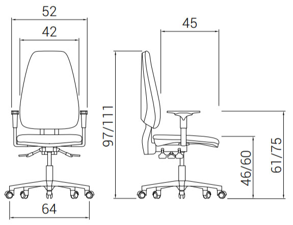 El conjunto se completa con una columna de gas Clase 4, testada para soportar hasta 150 kg, que permite ajustar la altura de forma suave y segura. La base de nylon negro de 62 cm de diámetro (opcionalmente disponible en aluminio pulido de 64 cm) garantiza estabilidad y resistencia, mientras que las ruedas dobles engomadas de 65 mm proporcionan un deslizamiento fluido y silencioso sobre cualquier superficie, incluso en suelos delicados, sin dejar marcas.