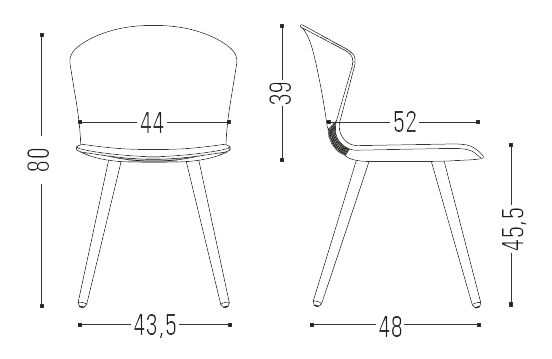 La base de cuatro patas de madera de haya, con forma cónica, se ofrece en acabado haya natural o lacado negro e incorpora conteras de polipropileno en negro con fieltro antideslizante para proteger el pavimento y reducir el ruido; como complemento, está disponible kit de soletas para suelos de moqueta o alfombra. La carcasa puede elegirse en blanco, negro o gris para coordinar con la base de madera y el resto del mobiliario.